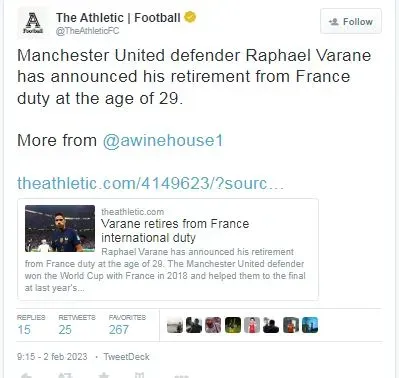 Unfortunately Raphael Varane will not be available for this game against Republic Ireland as he recently decided to retire from Franceโs national team international duty. He announced his retirement from the national squad in 2023.