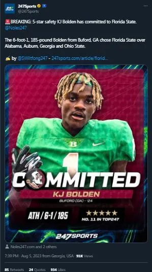 According to 247sports and Hayes Fawcett, the new 5-star safety to play for the Seminoles is KJ Bolden, he played high school football at Buford in Georgia, he is one of 5 already committed players to play for the Seminoles in the upcoming season.