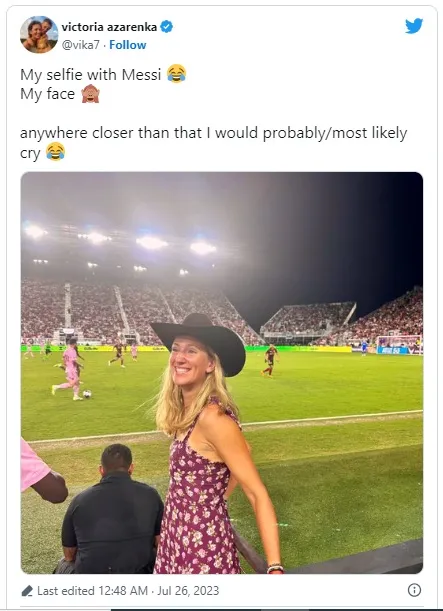During the match, Azarenka found herself in a memorable and amusing situation. She took a selfie pitch-side “with Messi”, capturing the joy of the moment on her official Twitter account. In her witty caption, Azarenka humorously expressed her emotions, stating what reaction getting any closer to Messi could spark. would probably result in tears of joy.
