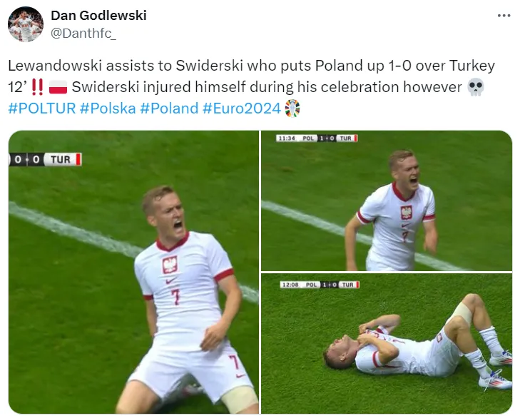 But to make things worse, Swiderski picked up an injury in strange fashion as he got hurt while celebrating Polandâs first goal against Turkey only 12 minutes into the match, following an assist by Lewandowski.