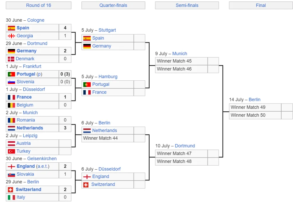 England and Switzerland will face off for the other semifinal spot, with the other side of the bracket looking much tougher: on Friday, Spain will play Germany before Portugal take on France.