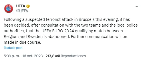 La suspensión del encuentro fue confirmada por la UEFA por medio de un comunicado en sus redes oficiales. “Tras un presunto ataque terrorista en Bruselas esta tarde, se ha decidido, tras consultar con los dos equipos y las autoridades policiales locales, que se suspenda el partido de clasificación para la UEFA EURO 2024 entre Bélgica y Suecia. Se realizarán más comunicaciones a su debido tiempo“.