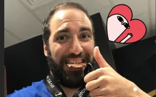En su cuenta de Instagram, Higuaín subió una selfie mordiendo la medalla en el vestuario de losBlues.