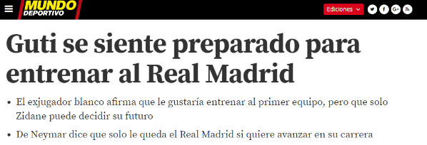Por las dudas, Guti ya se ofreció:“¿A quién no le gustaría entrenar alMadrid? Todos los madridistas estamos orgullosos deZidane, pero me veo preparado para entrenar”.