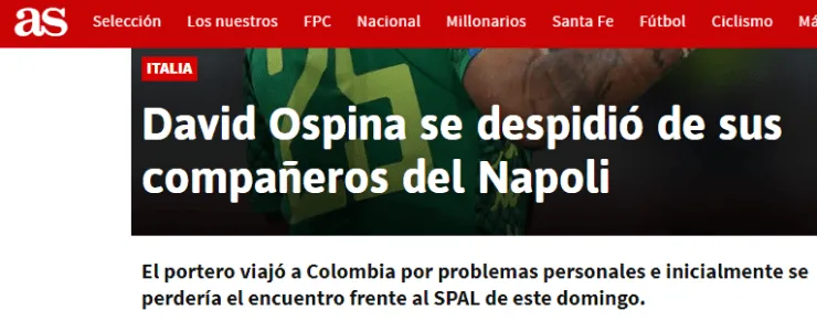 De forma sorpresiva, David Ospina tuvo que viajar de urgencia a su Colombia natal con el permiso de Carlo Ancelotti(entrenador del Napoli) por estar atravesando problemas familiares.