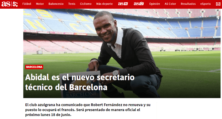 AS informó que Éric Abidalserá presentado de manera oficial en su nuevo cargo el próximo lunes 18 de junio. Si bien todavía no asumió en su nuevo trabajo, se deslizó lo que sería el primer objetivo del ex jugador del Barcelona de cara a lo que se avecina.