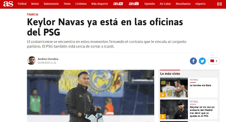 Según diversos medios europeos, Kelor Navas habría estampado la firma con el cuadro parisino este lunes por la mañana (las cámaras del programa El Chiringuito lo captaron incluso saliendo de las oficinas del club).