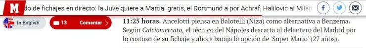 El motivo por el cual el DT se inclinó ante la alternativa de Super Mario recae en el valor de mercado deKarim Benzema, atacante del Real Madrid. El precio del francés se encuentra fuera de alcance para el elenco italiano, lo cual lo convierte en inaccesible.
