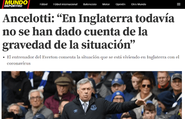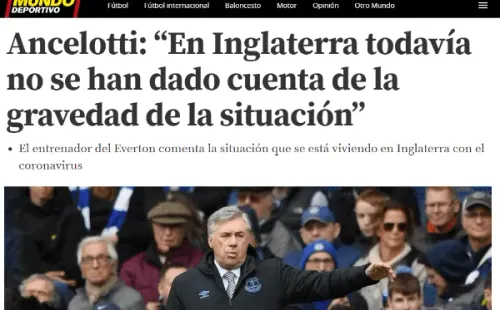Sobre esto le consultaron a Carlo Ancelotti, entrenador de Everton. El ex-Real Madrid se mostró muy enojado con que se siga hablando de fútbol y destacó que todavía no se dieron cuenta de la gravedad de la situación.