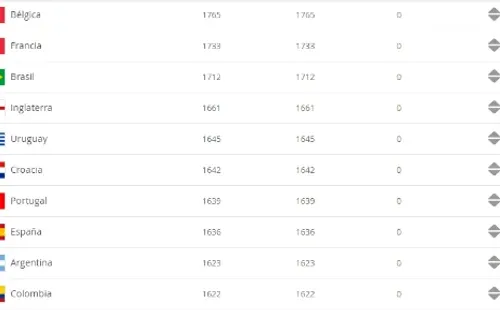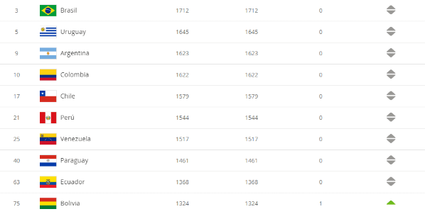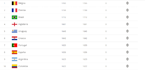 Como venía sucediendo, las selecciones sudamericanas que acompañan a Brasil en el top 10 son Uruguay (5°), Argentina (9°) y Colombia (10°).