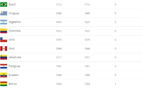 Para destacar también en este cierre de año es el 17° lugar de la Selección de Chile y la presencia de Perú merodeando el Top 20, en la posición 21°.