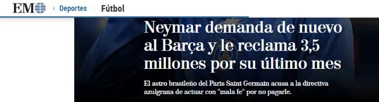 La prensa española detalla que el delantero de la Selección de Brasil reclama 3,5 millones de euros, que corresponden a un impago de su salario del último mes antes de irse a París, Francia.