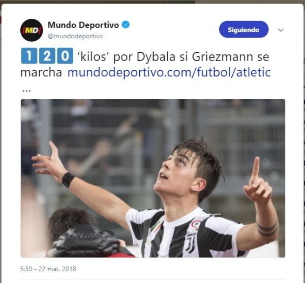Dybala es pretendido por el Atlético de Madrid, según titula Mundo Deportivo, pero para concretar la operación el equipo español deberá vender a Griezmann, quien ya dijo que quiere conocer su nuevo destino antes del Mundial.