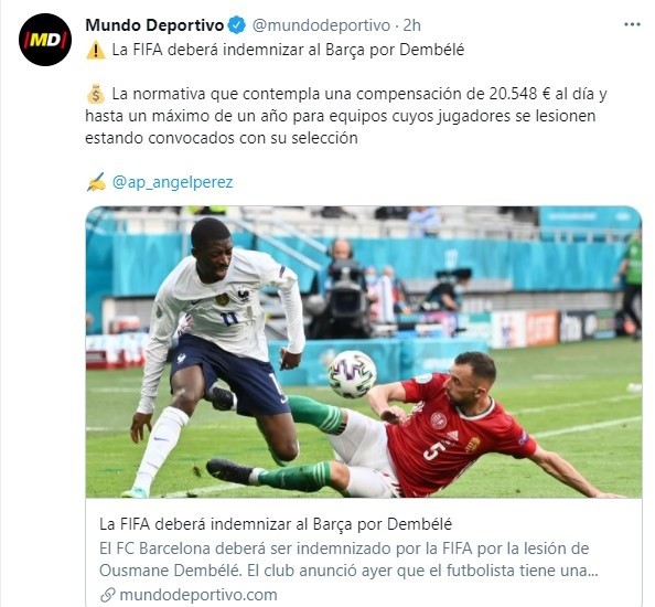 ¿Por qué será FIFA quien de dinero al club por la lesión del mosquito? Basándonos en las regulaciones para encuentros internacionales del máximo ente de este deporte que rigen desde 2019, los clubes que vean a sus jugadores caer lesionados en competiciones oficiales de carácter internacional, deberán ser remunerados desde Zúrich. En lo que serán casi 4 meses de baja, Barcelona recibirá una jugosa cifra.