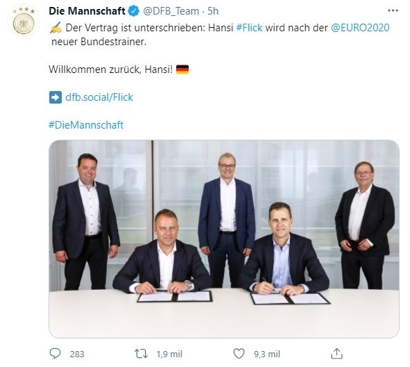 Por medio de sus redes sociales y página web, la Federación Alemana de Fútbol confirmó el acuerdo con el ganador del sextete hasta 2024, fecha donde la Euro será realizada en tierras germanas. Por un sueldo cercano a los 6.5 millones de euros, Laporta se queda sin su tapado para el banquillo.