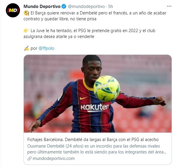 Leonardo siempre ha admirado el juego de Dembelé. Le considera una de las grandes estrellas a futuro y un autentico diamante en bruto. Sabiendo que pueden ahorrarse un millonario traspaso que impida reforzar aun más al PSG, desde Francia le pedirían salir gratis en 2022 con destino a la capital francesa.
