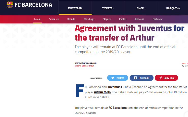 Confirmando las especulaciones que rondaban en torno al destino del futbolista desde hace unas cuantes semanas, la institución Culé, mediante un comunicado oficial lanzado a través de sus distintos canales de comunicación, anunció que el crack carioca pasará a portar los colores de la Juventus una vez culmine la temporada 2019/2020.
