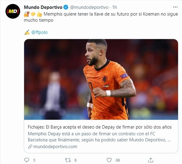 Mundo Deportivo marca cómo para neerlandés ha sido clave la confirmación de Ronald Koeman al frente del equipo. Depay sabía que sus opciones para pelear por el puesto se hubiesen visto disminuidas en caso de que el entrenador no hubiese continuado. Eso sí, el punta parece tener en claro que el DT no continuará por mucho tiempo dirigiendo al plantel.