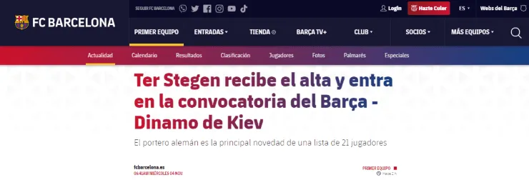 A horas del encuentro ante Dinamo Kiev por Champions League, el conjunto Blaugrana publicó la lista de nominados para el partido en cuestión. Instantes después, exteriorizando noticias importantes en relación al portero, Barcelona manifestó que Ter Stegen recibió el alta médica y podrá estar a disposición de Ronald Koeman.