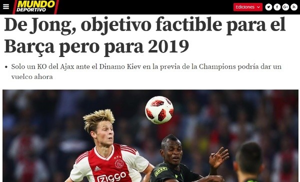Como consecuencia, De Jong se mudaría a la formación catalana recién en 2019. La única forma de que se adelante su transferencia tendría que ver con una eliminación de su equipo frente a Dinamo Kiev, en la fase previa de la Champions League.