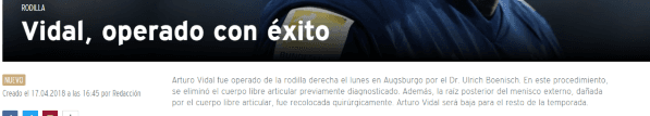 Se confirmó la peor noticia. Arturo Vidal fue operado con éxito dela rodilla derechaestelunes en Augsburgo.