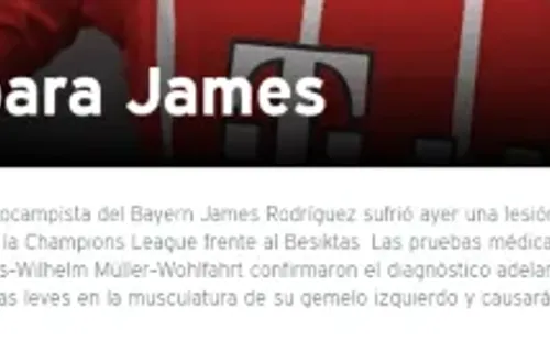 “El centrocampista del Bayern James Rodríguez sufrió ayer una lesión leve durante el duelo de ida de los octavos de final de la Champions League frente al Besiktas. Las pruebas médicas realizadas hoy miércoles en la clínica del Dr.Hans-Wilhelm Müller-Wohlfahrt confirmaron el diagnóstico adelantado ayer. El jugador colombiano sufre unas molestias leves en la musculatura de su gemelo izquierdo y causará bajas durante los próximos entrenamientos”, comunicaron.