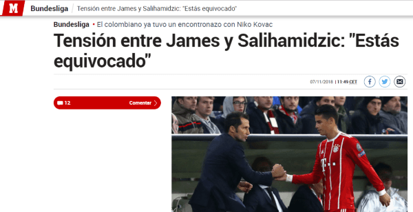 Aparentemente, James le negó un apretón de manos director deportivo del elenco bávaro, Hasan Salihamidzic.