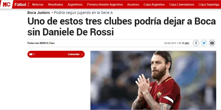 Sin embargo, teniendo en cuenta que el único amor de De Rossi en Italia es justamente la Roma, la pasión del jugador podría llevarlo a rechazar cualquier oferta que provenga de un club que no sean Los Amarillorojos.