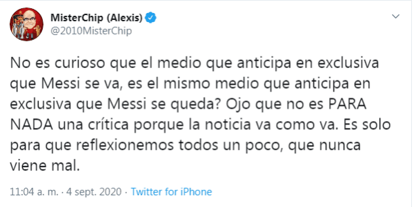 “No es curioso que el medio que anticipa en exclusiva que Messi se va, es el mismo medio que anticipa en exclusiva que Messi se queda? Ojo que no es PARA NADA una crítica porque la noticia va como va. Es solo para que reflexionemos todos un poco, que nunca viene mal”, escribió.