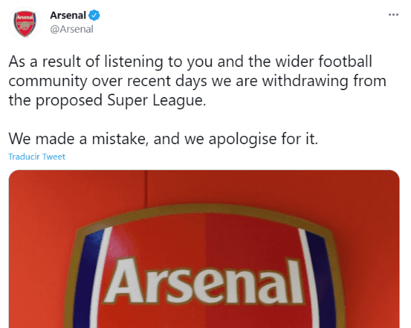 Unade lasque más sorprendió fue la publicación de los ‘Gunners’, quienes pidieron disculpas por su error y dejaron en claro que la presión de la gente tuvo mucho que ver. El resto se limitó a escribir documentos mucho más institucionales, simplemente avisando su retroceso. Ahora queda por esperar qué sucedera con el resto de los fundadores.