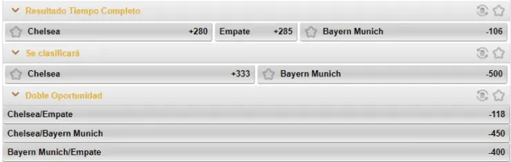 El favorito para este juego en Caliente.mx es el Bayern Múnich, que paga +106 veces lo quee juegues, en desmedro de los +280 que paga Chelsea. Si crees que termina en empate, paga +285.