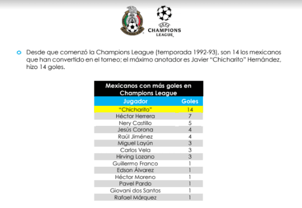 Según los datos que aporta Opta, el delantero es el mexicano que más goles convirtió en la historia de la competición más importante del continente, contando incluso el inicio de dicho torneo en la temporada 1992/93. Y destacándose por encima de otros 13 compatriotas que supieron anotar.