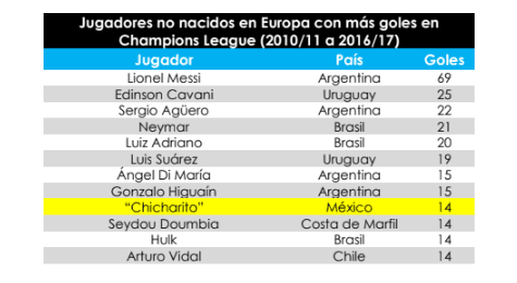 Para dimensionar más lo conseguido en Europa, existe una tabla de máximos artilleros no nacidos en Europa. Ahí, ampliamente, se destaca Lionel Messi con 61 tantos pero Chicharito figura noveno, por detrás de Edinson Cavani, Sergio Agüero, Neymar, Luiz Adriano, Luis Suárez, Ángel Di María y Gonzalo Higuaín.