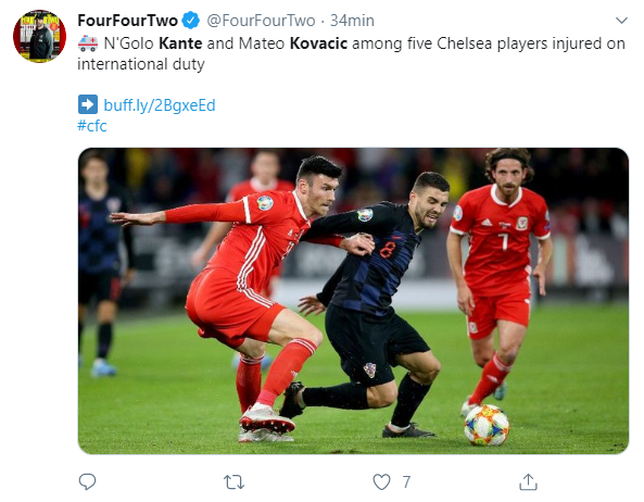 N’Golo Kanté se lesionó este viernes, mientras realizaba la entrada en calor previa a jugar con Francia. Mateo Kovacic, que tuvo que abandonar el partido entre Croacia y Gales; yAndreas Christensen, que también salió sustituido por una lesión del duelo entre Dinamarca y Suiza.