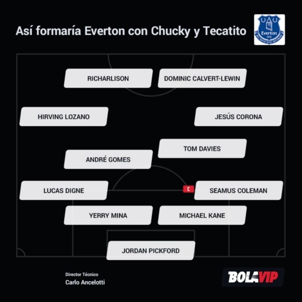 En caso de darle el gusto al estratega italiano fichando a los dos mexicanos, y suponiendo que el equipo no sufre ninguna baja de peso, los Toffees podrían presentar la próxima temporada un 11 inicial compuesto por: Jordan Pickford; Seamus Coleman, Michael Keane, Yerry Mina, Lucas Digne; Tom Davies, André Gomes; Jesús Corona, Hirving Lozano; Richarlison y Dominic Calvert-Lewin.