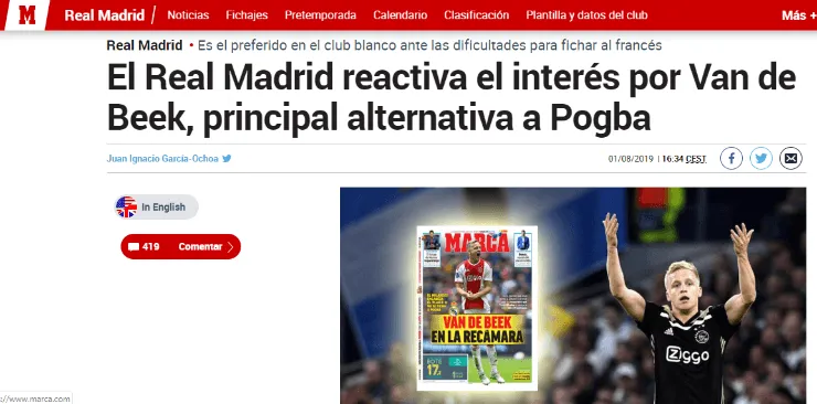 Sin embargo, prácticamente dejándolo como una segunda opción, el elenco Blanco mudó sus pretenciones a la Premier League y apuntó todos los cañones a hacerse con los servicios de Paul Pogba.