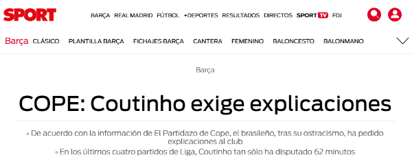 Según señaló Sport,Philippe Coutinho no estaría de todo al gusto con respecto a su poca participación dentro del campo de juego del Barcelona.