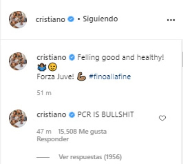 En la zona de los comentarios, exteriorizando su fastidio por no poder estar presente en el cotejo ante el conjunto de la Liga Española, Cristiano no se guardó nada y agregó: “Los PCR son una mier…”.