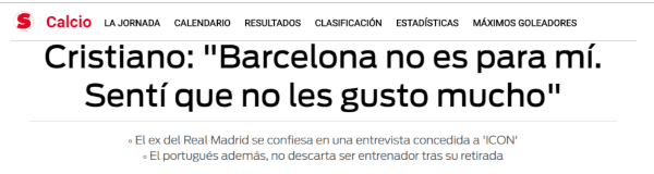 En una entrevista con ICON, el delantero de la Selección de Portugal se refirió a lo que siente cuando visita Barcelona: “No es para mí, no. Fui ahí una o dos veces y sentí que ahí no les gusta mucho Cristiano. Pero es normal por la rivalidad. No pasa nada”.