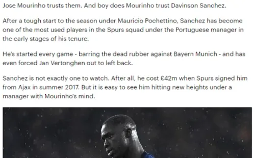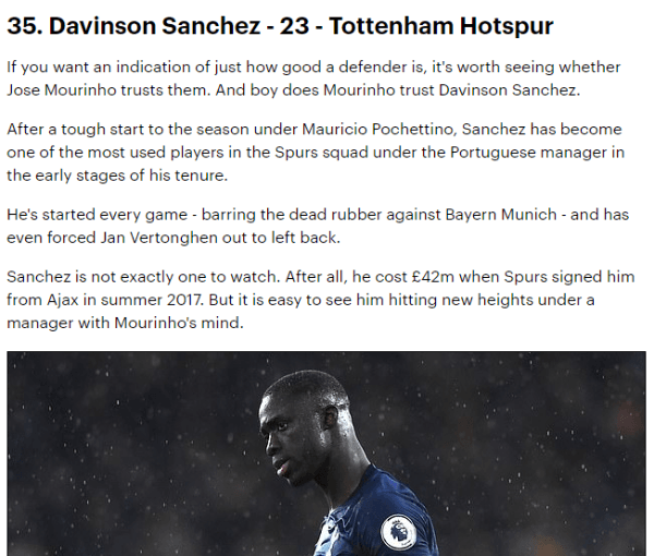Otra vez, Daily Mail lo incluyó en su popular lista de los 50 mejores jugadores sub23 en Europa. Lo ubicaron en el puesto 35 y lo catalogaron como la “promesa en la que más confía José Mourinho”. Desde que llegó ‘Mou’ a los Spurs, el colombiano nunca faltó en la titular.