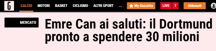 En el último día del mercado de pases, todo indica que Can será presentado como nuevo jugador delBorussia Dortmund. Así lo informan desde Italia.