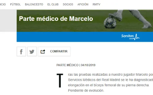 Este viernes, a apenas un día del cotejo por disputarse ante Granada (en el marco de una nueva jornada por la Liga Española), la institución Merengue lanzó un nuevo parte médico del deportista en cuestión: “Tras las pruebas realizadas a nuestro jugador Marcelo por los Servicios Médicos del Real Madrid se le ha diagnosticado una elongación en el bíceps femoral de su pierna derecha. Pendiente de evolución”.