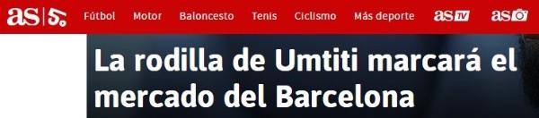 SegúnAs, de la rodilla deUmtitidepende que el Barcelona salga a gastar millones de euros en el próximo mercado de pases. En caso que recaiga en su lesión, los directivos ficharán a un quinto central para que sea suplente de Piqué y Lenglet.