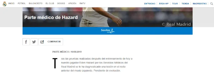 A través de la cuenta oficial de la institución, el club Merengue publicó un parte médico oficial de Hazard. El mismo, detallando que Eden aqueja una “lesiónen el recto anterior del muslo izquierdo”, informó que la dolencia física del deportista está “pendiente de evolución”.