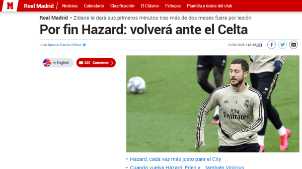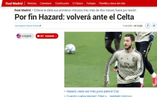 Según Marca, Hazard ya está recuperado y podrá contar con minutos ante Celta el próximo domingo. Zidane lo pondrá a jugar los últimos 30 minutos para que vaya ganando ritmo.