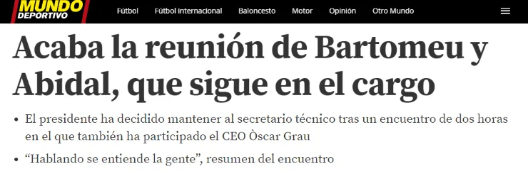 En la charla también estuvo el CEO, Òscar Grau, y ambos han decidido no tomar ninguna decisión drástica respecto al francés:seguirá como secretario técnico del Barcelona. Después de rumores de un posible despido, el club quiere mantener las aguas lo más calmas posibles.