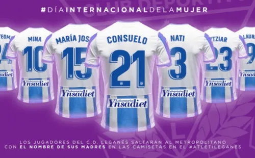 “SOCIAL I Los jugadores del C.D. Leganés saltarán al Metropolitano con el nombre de sus madres en la camiseta celebrando el #DíaInternacionalDeLaMujer #LeganésAtleti @Ynsadiet lucirá en la trasera de la equipación”.