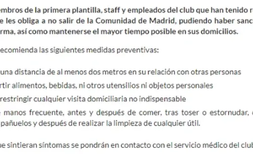 Por otra parte, también decidieron dar la orden de que ningún jugador o empleado salga de la comunidad de Madrid. Esto en pos de prevenir cualquier tipo de riesgo innecesario y que nadie más se contagie.
