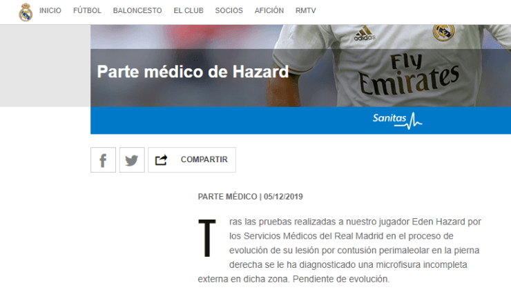 Emitiendo un parte médico en el cual se informó que el atacante padece una“microfisura incompleta externa en dicha zona”, el Real dio a entender que Hazard no estaría presente en el Clásico ante el Barcelona por el certamen local.