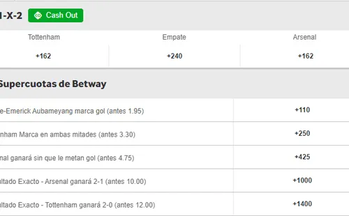 Betway te cuenta que tanto el Tottenham como el Arsenal corren como favoritos para ganar este juego, ya que ambos pagan +162 en los momios. Ahora, si piensas que terminará en empate, paga +240.